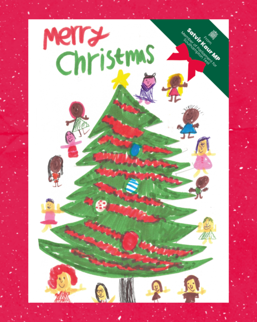 I totally fell in love with Hallie’s artwork, particularly all the different people coming together around the tree. For me, it sums up the spirit of togetherness that Christmas represents, whilst also reflecting our vibrant and welcoming city. Hallie is the proud winner of a special mascot experience at an upcoming Saints home match at St Mary’s, very kindly provided by Southampton Football Club, along with a goodie bag full of prizes from the House of Commons. That, along with having her design on my official Christmas card this year, which goes to loads of different people including the Prime Minister!
